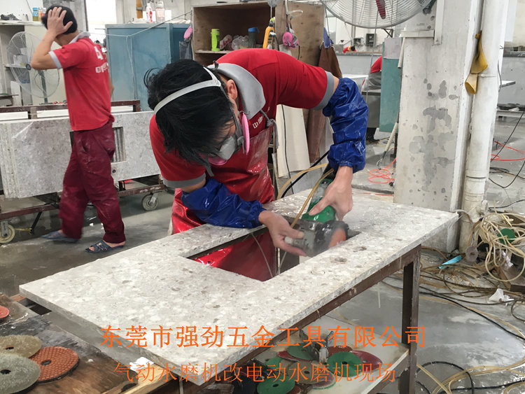 2016年9月20日我司受邀中旗新材料集團(tuán)參觀考察,并協(xié)助完善生產(chǎn)線上電動(dòng)水磨機(jī)改氣動(dòng)水磨機(jī)的工作。中旗集團(tuán)是專業(yè)生產(chǎn)加工石英石一條龍服務(wù)的公司,主要為國(guó)內(nèi)外各大品牌櫥柜企業(yè)提供石英石臺(tái)面等石英石產(chǎn)品。在工廠轉(zhuǎn)型升級(jí)的過(guò)程中,為了員工的健康和安全著想,需要把電動(dòng)水磨機(jī)改氣動(dòng)水磨機(jī)。因?yàn)楫a(chǎn)品材質(zhì)特殊,很多的工序都必須水磨作業(yè),所以漏電的風(fēng)險(xiǎn)就非常大。