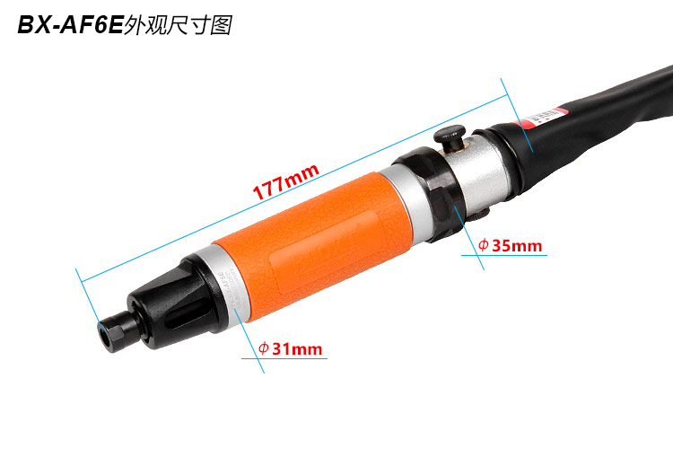 • 產(chǎn)品參數(shù): 夾頭直徑:5mm 往復(fù)行程:6mm 行程轉(zhuǎn)數(shù):7500bpm 總 長(zhǎng):177mm 耗 氣 量:0.25m3/min 重 量:0.58kg;使用工作壓力:0.65Mpa;推薦氣管尺寸:8mm