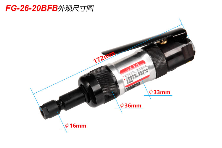 • 產(chǎn)品參數(shù): 夾頭能力:M6 馬達(dá)功率:0.35HP 空載轉(zhuǎn)速:24000rpm 工具能力:砂輪磨頭M25,旋轉(zhuǎn)銼刀M13 耗 氣 量:0.45m3/min 全 長(zhǎng):172mm 重 量 : 0.62kg 噪 音 值:83db(A) 【工業(yè)型/扳機(jī)式開(kāi)關(guān)】