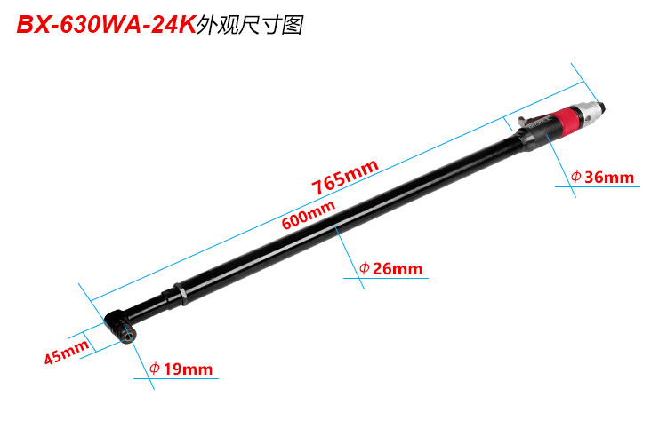 • 產(chǎn)品參數(shù): 夾頭尺寸:標(biāo)配6mm;(選配3mm,1/4") 空載轉(zhuǎn)速:3000rpm; 工具總長:765mm; 工具重量:1.35kg; 側(cè)排氣; 耗氣量:540L/min; 使用工作氣壓:0.65Mpa; 推薦使用內(nèi)徑8mm氣管; 平時(shí)使用應(yīng)多加氣動(dòng)油保養(yǎng)。 【定制款/特加長/慢速打磨】